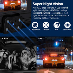 【Superior Night Vision with IR Light & WDR Technology】The car dash cam adopted high resolution CMOS image sensor and built in 4 IR lights with F2.0 aperture to capture more light,the interior car camera equiped with night vision function ensure take clear image at night. In attention, the dashcam wide dynamic range can automatically balance overexposure or underexposure even at night or at the entrance and exit of tunnels to give more clearer and natural images for you.