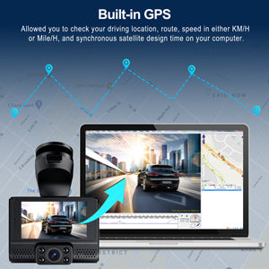 The built-in GPS module helps the 3-channel dash cam accurately record the car's location data, including speed in KM/H or MP/H, location and time stamp during the trip, allowing you to track GPS data on your PC.