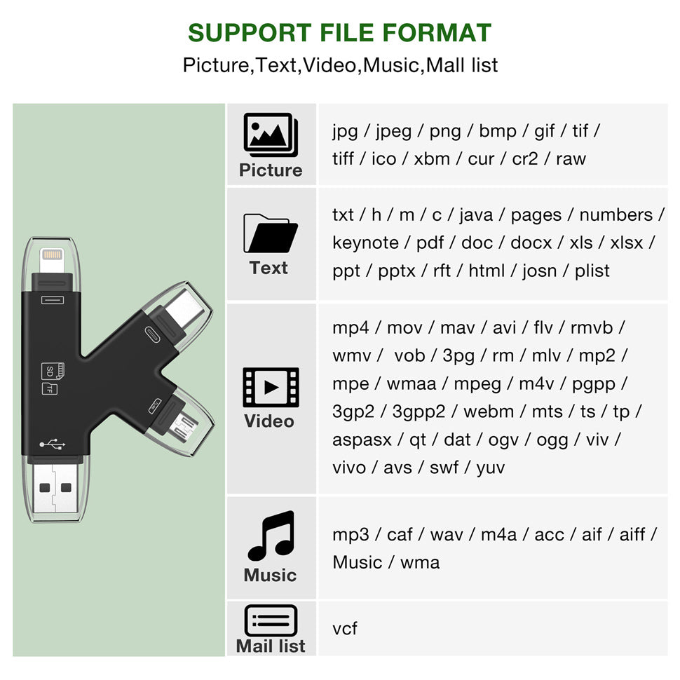 The integrated design of the Campark USB 2.0 card reader provides high-speed access to 2 different types of memory cards and supports multiple forms of memory cards including: Micro SD, Micro SDHC, Micro SDXC, SD Card Reader, SDXC, SDHC, RS-MMC, MMC Micro. 4-in-1 multi-function interface design with. Lightning/Type-C/Micro USB/USB, can be easily used with cell phones, computers, laptops, trail cameras, etc. A card reader to meet the needs of a variety of different device interfaces and memory cards, easily expand the storage space of the device.