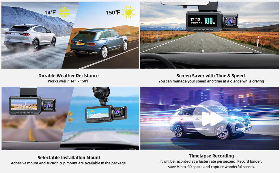 【Come with Endurance U3 64GB SD Card】 This 3 Channe dashcam comes with a U3 64 GB SD Card, whose premium performance allows dash cams to run longer. Ensure that the dashcam captures high-quality footage at any time or location. Avoid purchasing an unsuitable memory card and wasting your hard-earned money. It is the most reliable, cost-effective, and overall safest choice.