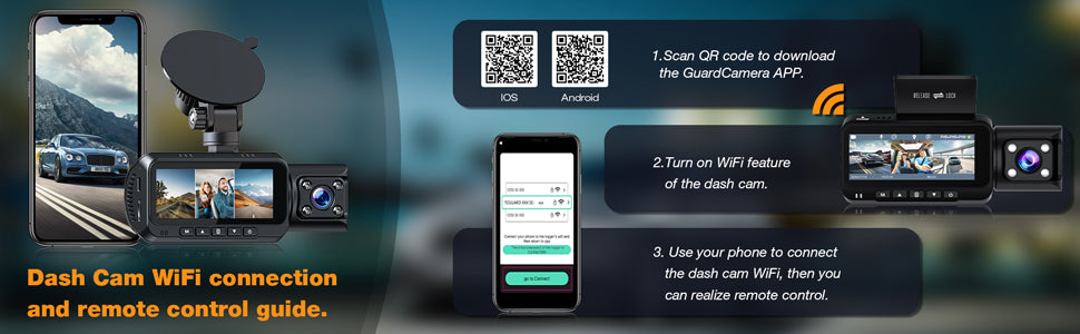 This CE66A, 3-channel dash cam front, inside, and rear is equipped with WIFI & GPS. Comes with a dedicated APP connection, iOS can download "Guardcam" from Google Play/Apple Store, and for Android, please scan the QR code in the manual to download.