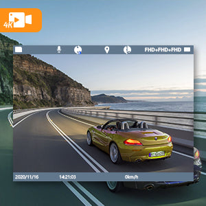 【Triple Channel Dash Cam & Two Recording Options】 - The front(170°), rear(150°), and cabin(150°) lenses on the 3 channel dashcam record videos at 2K+1080P+1080P@30fps simultaneously. And you can configure the settings to record either the front and interior of your vehicle in 4K + 1080P high resolution. The built-in super microphone clearly captures sound to provide solid evidence during collisions and other incidents, providing you with all-around protection. The adjustable inside camera with ultra-wide-angle lens allows for greater flexibility and extensibility in capturing more details.