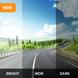 The dash camera, which is equipped with WDR technology, provides excellent exposure and dynamic range in low-light situations such as driving into the sun or nighttime oncoming traffic headlights.