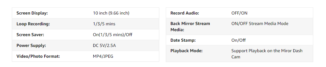 【10"IPS Full Touch Screen】 10-inch Full Touch Screen uses a 2.5D glass curved screen, More suitable for the curvature of the human retina, and fits better with the curved surface of the fingers. Makes touch screen operation smoother and more responsive. More ideally compatible with most rearview Mirrors, less bulky and more securely mounted, won't cause the recorded video to shake. Large-screen replay, restore the real scene.