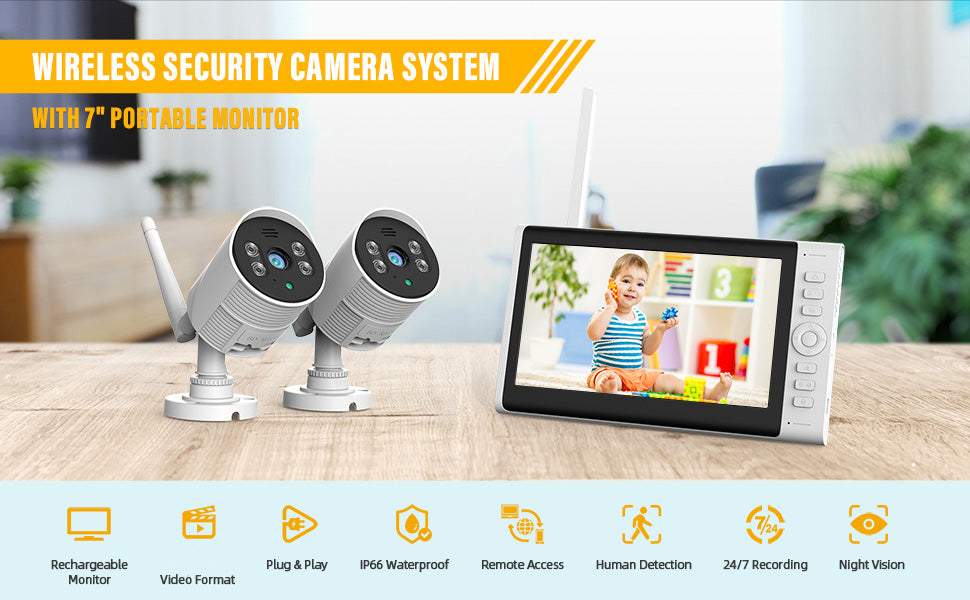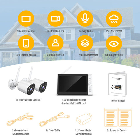 【Wireless Camera with 7" Portable Monitor】This wireless security camera system features an all-in-one design equipped with a 7-inch LCD monitor and 2 cameras for a clearer, wider viewing angle, and a built-in rechargeable battery so you can carry the monitor anywhere in your home. And the camera system comes with a 32GB memory card pre-installed, which supports 24/7 continuous recording and will automatically overwrite once the memory card is full.