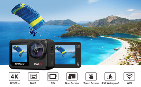 Featuring native 4K(3840x2160)/30fps, 2.7k/30fps, 2k/60fps, 1080P/60fps video resolution and 20MP crystal clear photo. Campark V40 action camera captures vivid, crystal clear and smooth footages for your adventures moments.