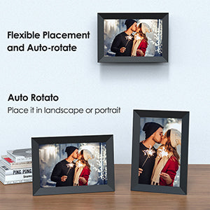 - Auto-Rotate - The digital picture frame wifi with app can automatically rotate photos to adjust the direction, which allows you to place the WiFi photo frame in either portrait or landscape mode. This digital photo frame also has multiple slide show effects, and you can choose to play your photos randomly or sequentially. When you are ready to send photos, you can also add funny captions and select the most important part.
