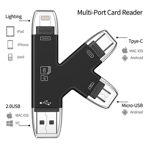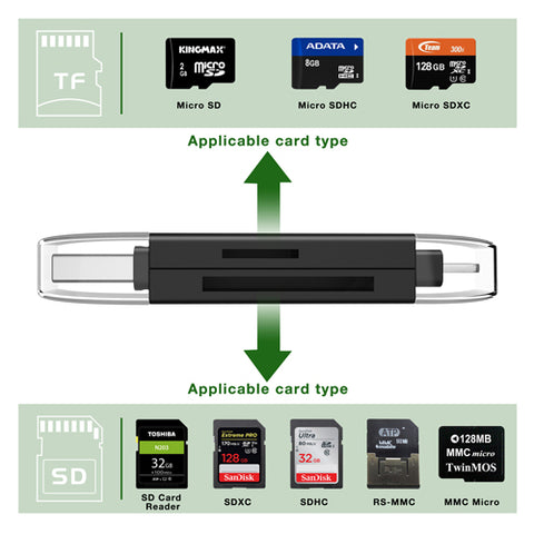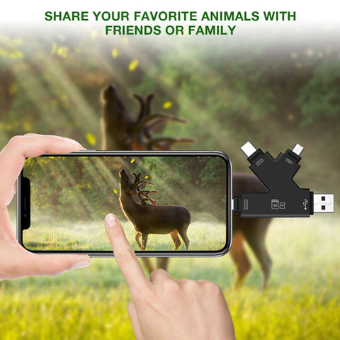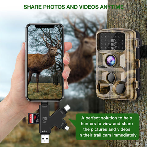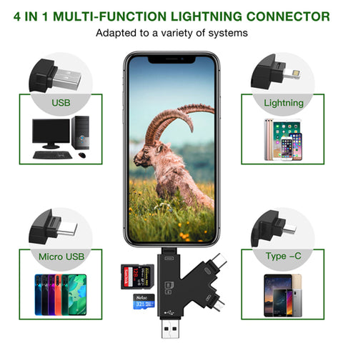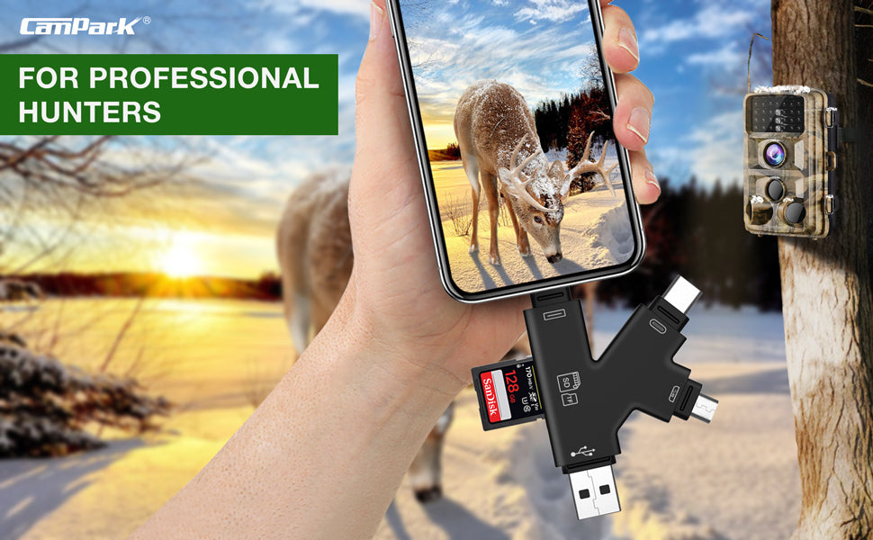 The integrated design of the Campark USB 2.0 card reader provides high-speed access to 2 different types of memory cards and supports multiple forms of memory cards including: Micro SD, Micro SDHC, Micro SDXC, SD Card Reader, SDXC, SDHC, RS-MMC, MMC Micro. 4-in-1 multi-function interface design with. Lightning/Type-C/Micro USB/USB, can be easily used with cell phones, computers, laptops, trail cameras, etc. A card reader to meet the needs of a variety of different device interfaces and memory cards, easily expand the storage space of the device.