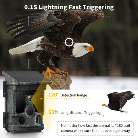 Solar-powered tracking camera equipped with 3PIR Sensors, with 120°detection angle and an ultra-fast trigger speed of 0.1s and 0.5s recovery time, you can easily capture a wider field of view and quickly capture every moment.