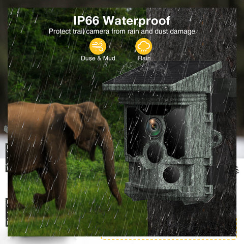 Both the trail camera and solar panel are IP66 waterproof, protecting your hunting camera from rain and dust damage even in harsh environments such as deserts or rainforests.
